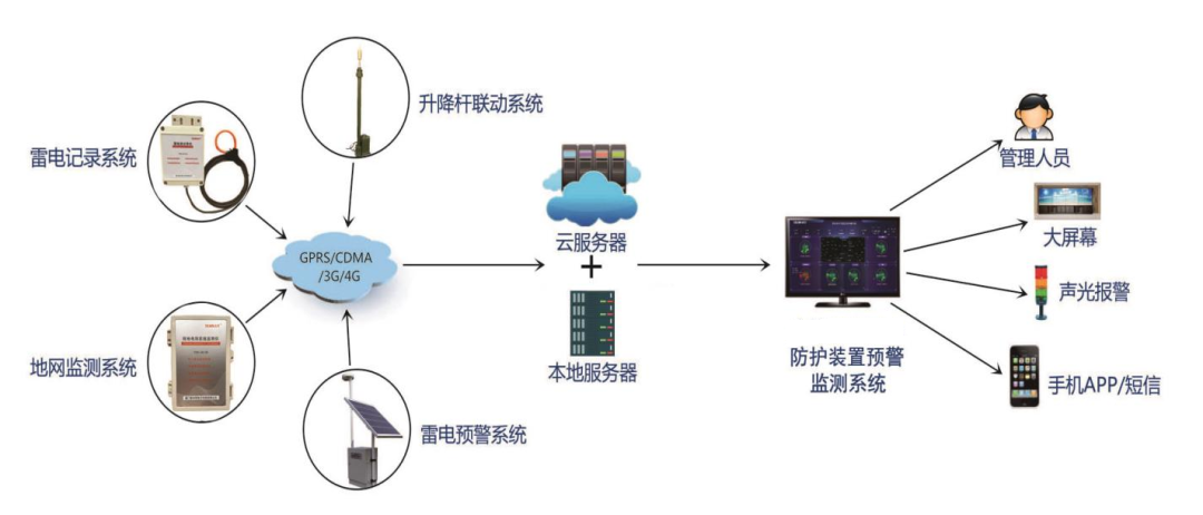 雷电智能在线监测系统应用了物联网、通讯、软件、云平台和大数据等信息技术,对各关键环节的防护装置进行实时监测、数据采集和分析、提前预警预报、隐患排查和应急处置操作,同时按区域要求部署雷电预警仪进行雷电预警,形成一套完整的“预报+防护”相结合的雷电综合防护解决方案。